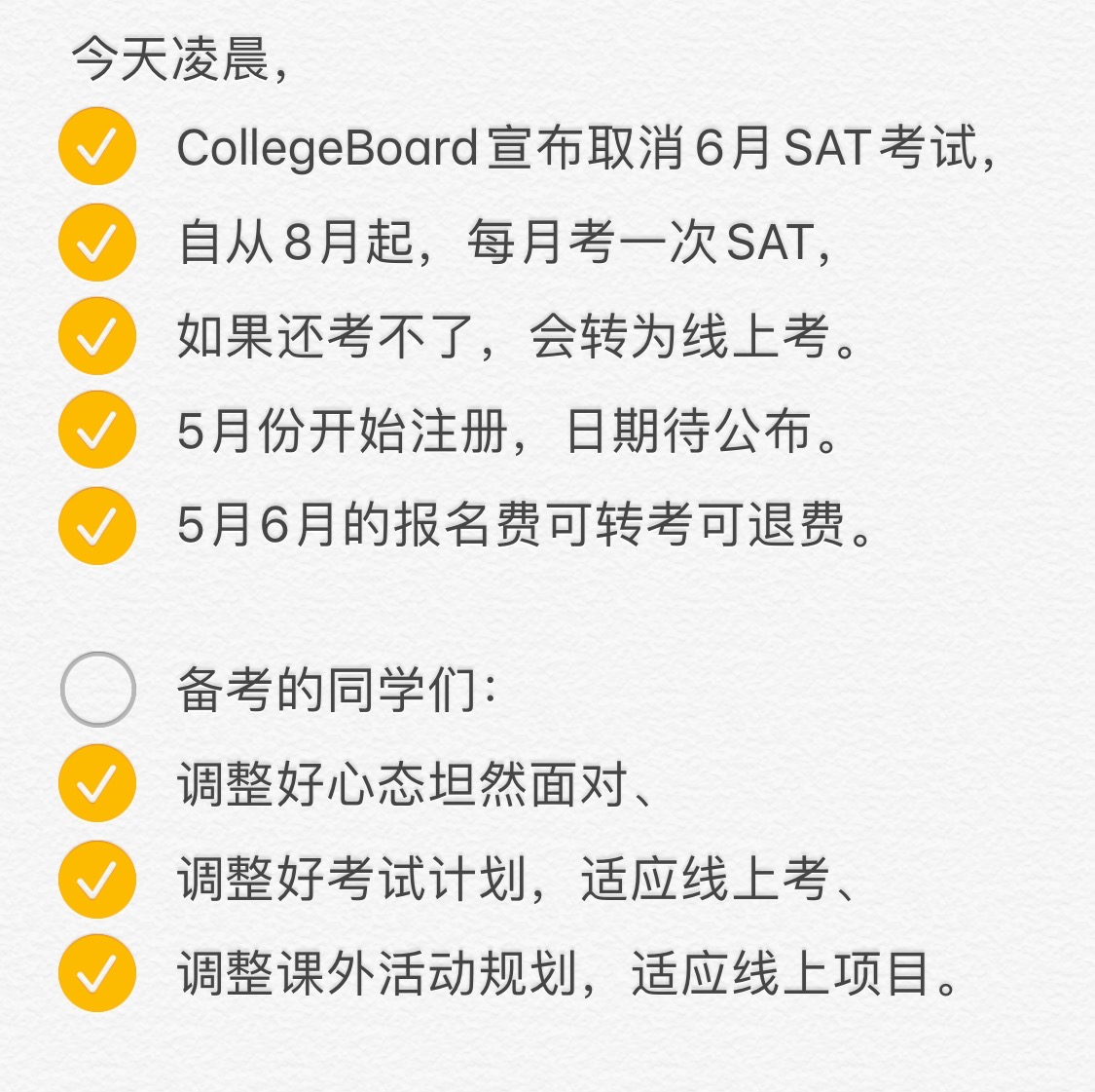 今天凌晨,CollegeBoar宣布取消6月SAT考试,自从8月起,每月考一次SAT,如果还考不了,会转为线上考。5月份开始注册,日期待公布。5月6月的报名费可转考可退费。备考的同学们:调整好心态坦然面对、调整好考试计划,适应线上考、调整课外活动规划,适应线上项目。