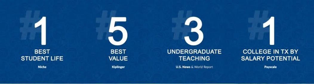 首先规模很小,但是优点不少。校园占地也就1.2平方千米,拥有6,000多名学生,但是在学术上以严谨的普林斯顿为模范,校园生活方面效仿牛津大学的住宿学院制,收费上相当于公立院校的水平(后文会详细说明)。各种头衔类似于“最佳生活质量”、“德州最佳薪酬潜力”等等,就不一一说明了,总之学校很不错。
