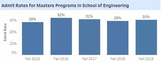 就学校给出的官方数据来看,莱斯的研究生院中,工程学院的硕士项目申请人数最多,去年达到了近3,000人,录取了906人,录取率30%。从近五年趋势来看,录取较为平稳,围绕在30%的水平上未出现较大波动。