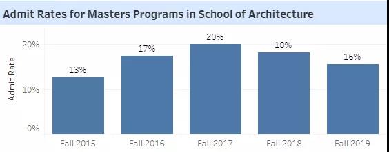在去年硕士项目录取率最低的则是学校的建筑学院和音乐学院,仅16%。且建筑学院在近三年的录取中呈现出降低的趋势。毕竟是全美前三水平的建筑专业,竞争力可想而知。