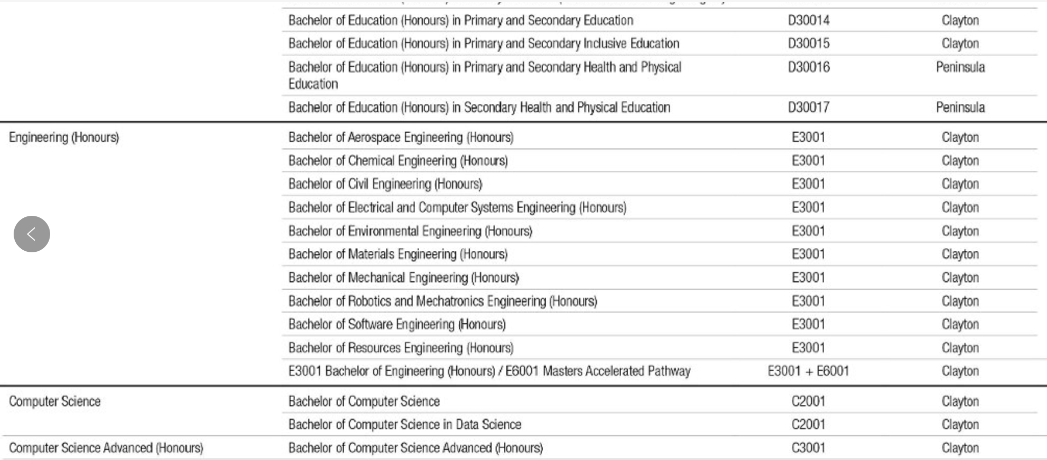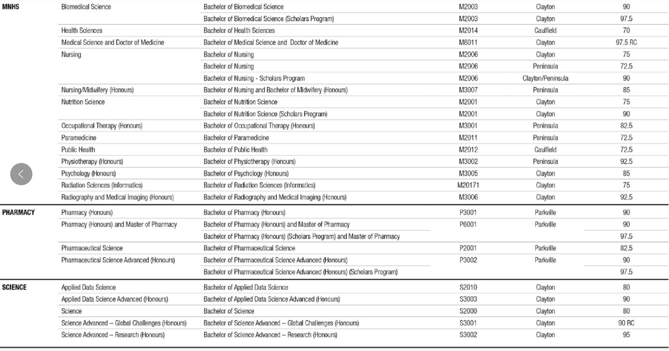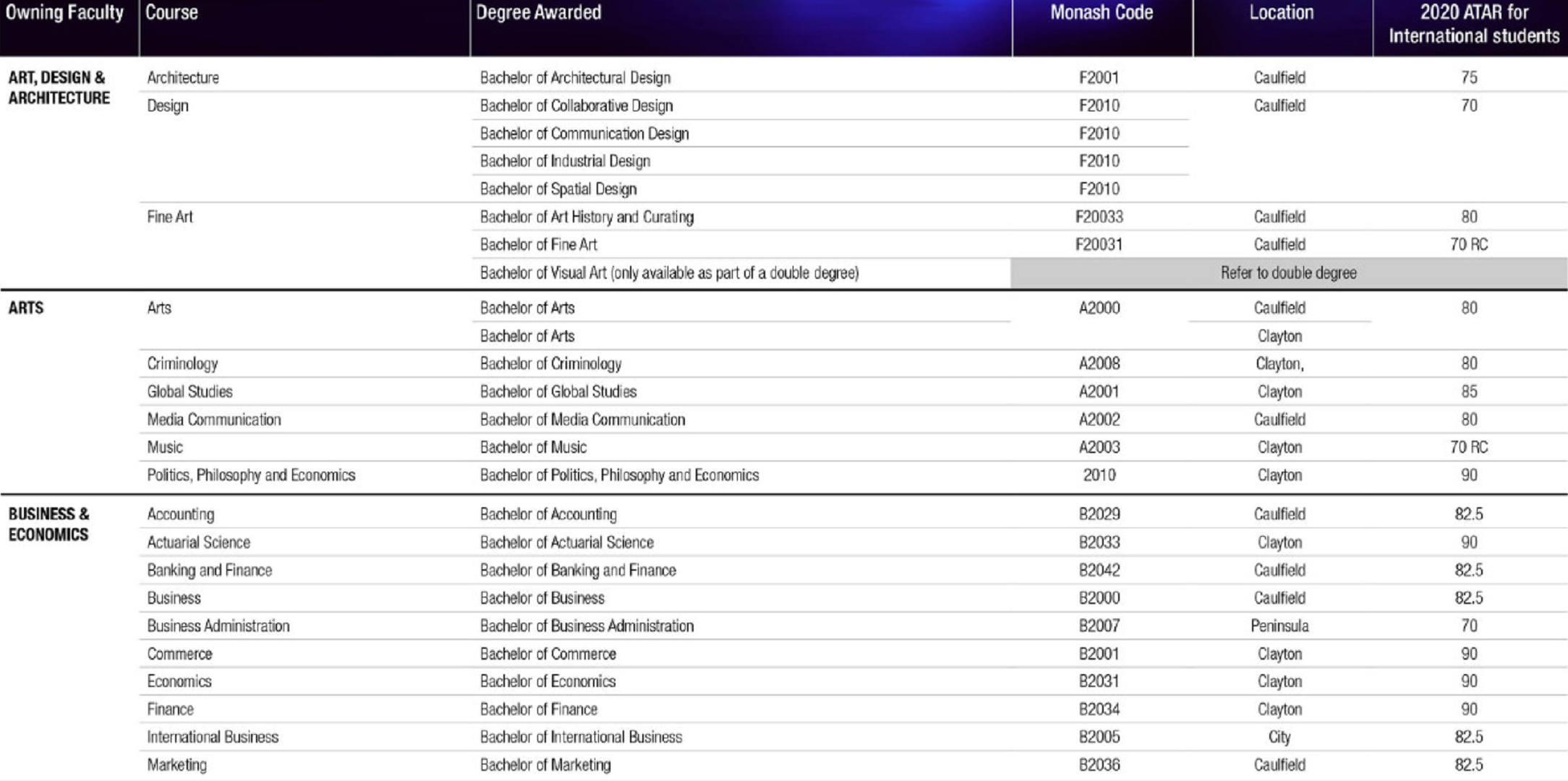 接下来为大家奉上最新版的【蒙纳士大学2020年各大专业对于国际学生的atar录取分数】