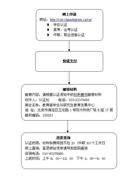 2、缴费方式: 学位认证费用请通过“快钱”方式缴纳,提交申请后,输入申请号和密码查询申请状态,点击“认证费支付”,可以通过网银、信用卡和线下支付三种方式付费,具体付费方式请按“快钱”页面提示操作。为避免支付限额的限制,保证认证费用准确、及时支付,建议您使用借记卡网银或信用卡专业版网银支付,费用可在5分钟内支付成功。如选择线下支付方式,根据您办理汇款的银行不同,一般在3-5个工作日支付成功。