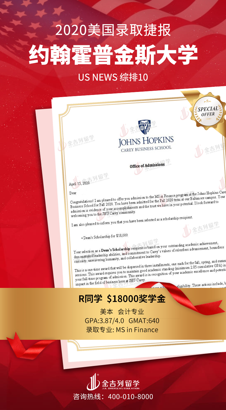 录取院校:约翰霍普金斯大学,同时获得18000美金奖学金