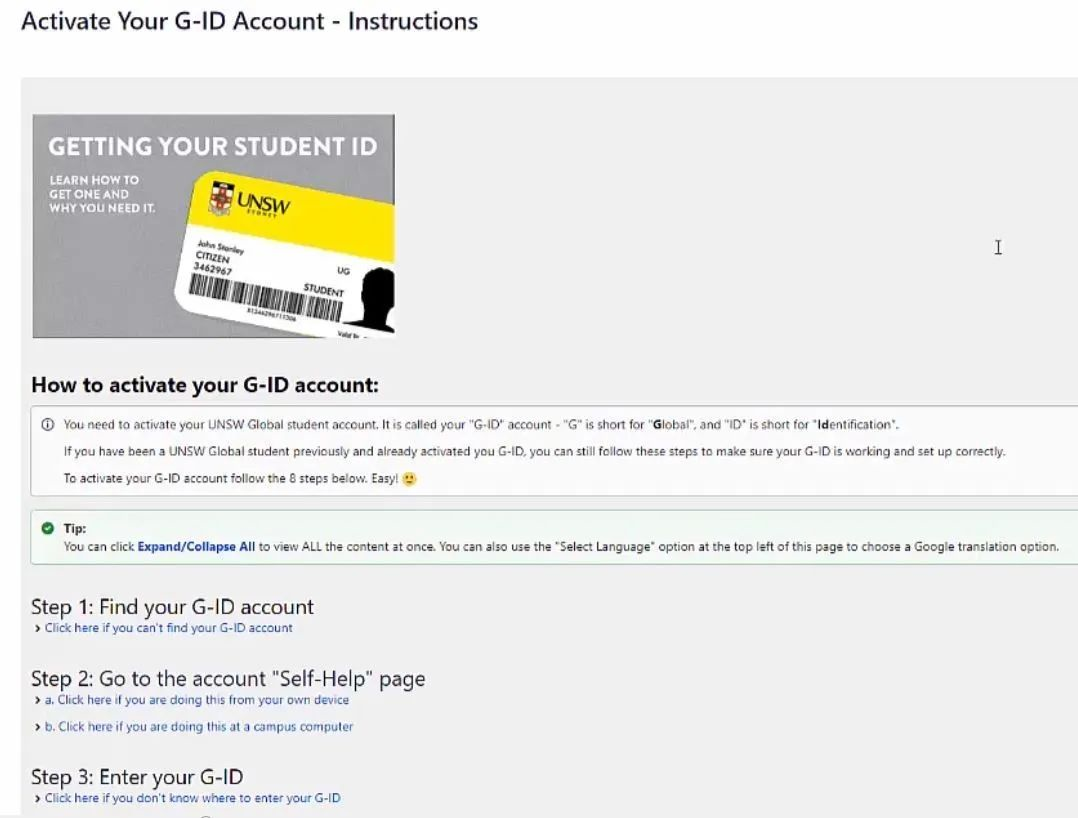 接下来浏览器应当弹出下图所示的窗口,还未激活账号的同学请点击蓝色的Activate G-ID选项,激活自己的UNSW Global账户。