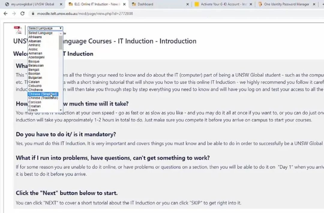 打开 my.unswglobal.unsw.eu.au 并进入网课IT指南(IT Inuction)环节,按下图所示选择自己的课程(入读英语课程的同学请直接点击“英语课程”链接,即可按引导激活自己的账户)。