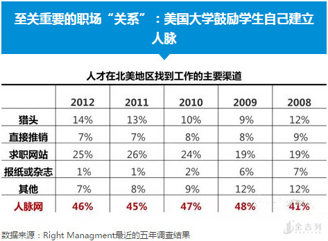 通过“关系”找工作并不是中国求职者的专利。一直以来,建立人脉网或者“关系” (Networking)被认为是在美国职场求职成功最有效的方式。全球人力资源行业巨头Manpower Group旗下的求职培训机构Right Management从2008年起连续五年针对北美地区总计46000求职者展开调研,结果发现:“人际关系或人脉的建立”仍然是人们找到新工作的最好方法。