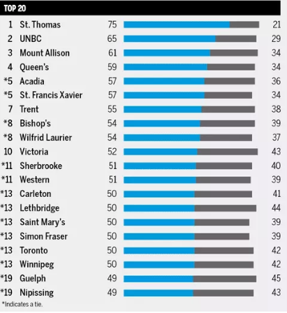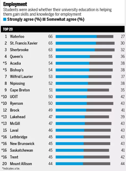 从这份调查结果来看,人气较高的,还是以就业、co-op项目出名的滑铁卢大学、皇后大学、毕索大学等加拿大名校;麦吉尔大学,有点“跌破眼镜”,麦吉尔大学和湖首大学一样,都是不到一半(47%)给了正面评价;