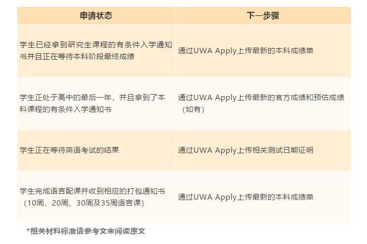 如果学生的入学成绩达到要求,需上传最新的成绩单;如果学生还在等待相应材料来满足入学要求时,西澳大学会根据实际情况来发放eCoE。下表概述了几种最常见的情况: