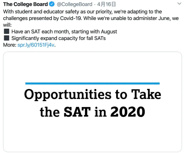 此外,美国大学理事会宣布,在疫情得到控制的情况下,8月至12月每月将举办一场SAT考试。因此,从8月份开始,美国境内的同学将有多次考试的机会。5月开始,学生们可以开始注册申请。