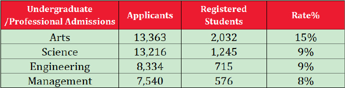上图是麦吉尔大学最热门的四个院系:文学院,理学院,工学院,商学院的2018年学生申请和注册数据,排序后可知,文学院注册人数最多,注册总数以及注册率(注册人数/申请总数)也是其中最高的。由此不难得出结论:麦吉尔大学文学院相对容易发放录取。