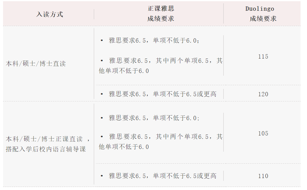 请同学们注意,目前我们所有线上语言课程均已满位,若之后有位子或者新的线上课程安排,大家届时将可以用Duolingo申请,分数要求如下: