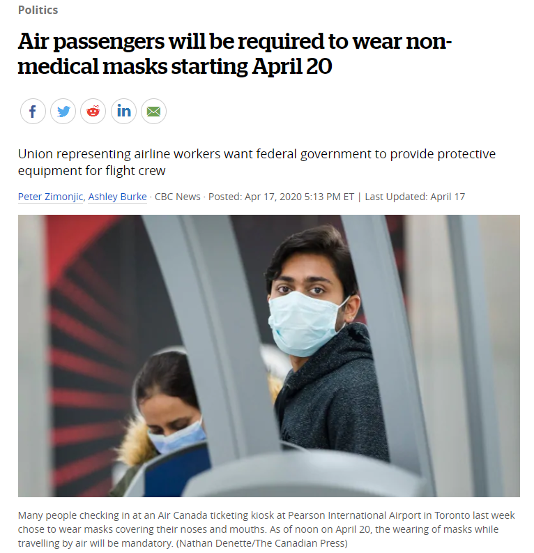 加拿大航空公司也发出了最新通告:从4月20日开始,所有乘客都必须佩戴口罩或遮挡口鼻的面罩,否则将无法登机。