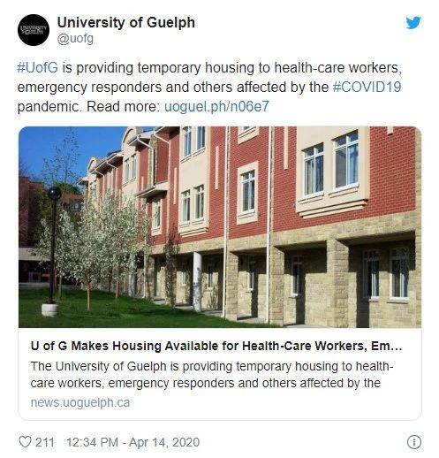 圭尔夫大学(University of Guelph)于4月14日(周二)宣布,目前已经将学生宿舍准备好,供那些暴露在新冠病毒下需要隔离,或是不想与家人接触的医护人员居住。