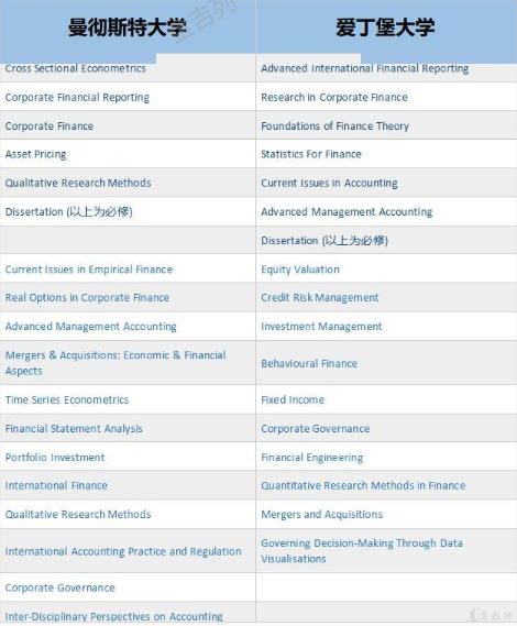 将两个学校的课程设置放到一起对比,我们能发现,曼彻斯特大学的 AF 相对爱丁堡大学来说更偏向金融,尤其是公司金融。除了两门公司金融必修课之外,选修课中公司金融、公司管理、公司并购等方面的内容也应有尽有。