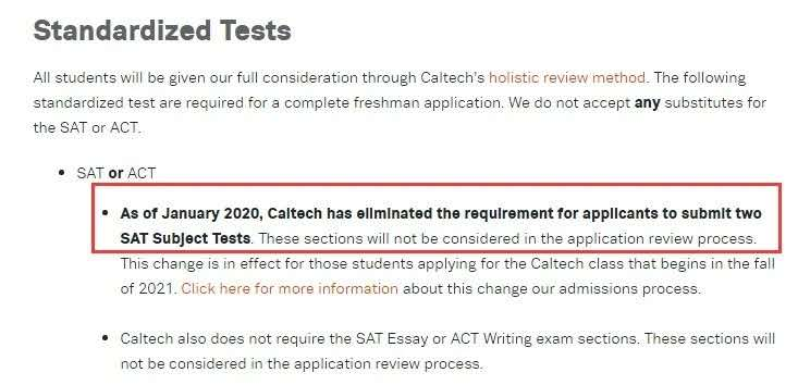 2020年1月份起,加州理工学院取消了申请者提交两份SAT科目考试的要求。在申请审核过程中将不考虑这些部分。同时,这项更改对2021年秋季开始申请Caltech课程的学生有效。