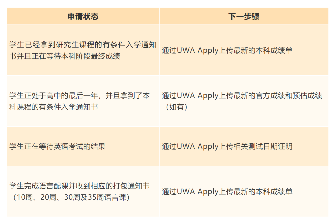 如果学生的入学成绩达到要求,需上传最新的成绩单;如果学生还在等待相应材料来满足入学要求时,西澳大学会根据实际情况来发放eCoE。下表概述了几种最常见的情况: