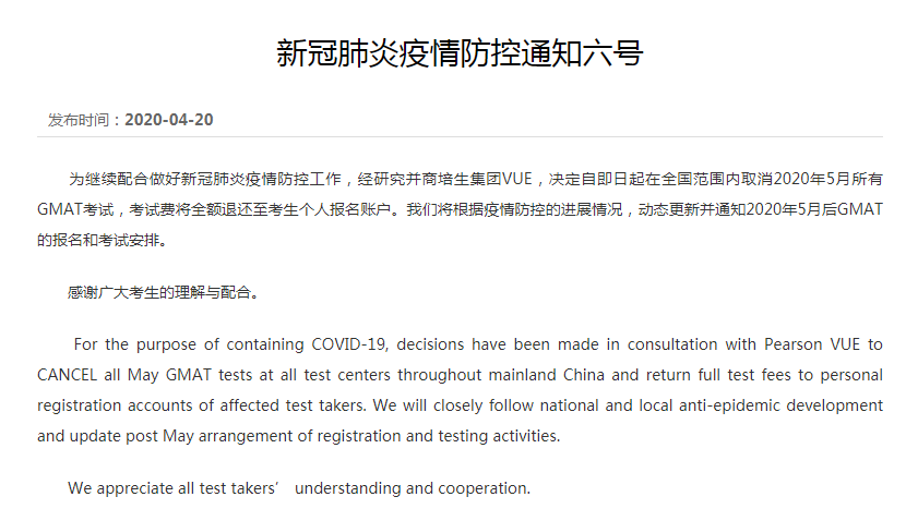 为继续配合做好新冠肺炎疫情防控工作,经研究并商培生集团VUE,决定自即日起在全国范围内取消2020年5月所有GMAT考试,考试费将全额退还至考生个人报名账户。我们将根据疫情防控的进展情况,动态更新并通知2020年5月后GMAT的报名和考试安排。