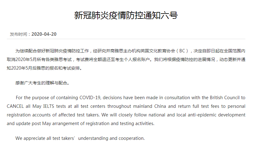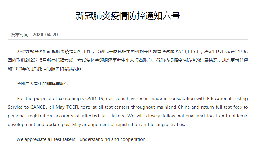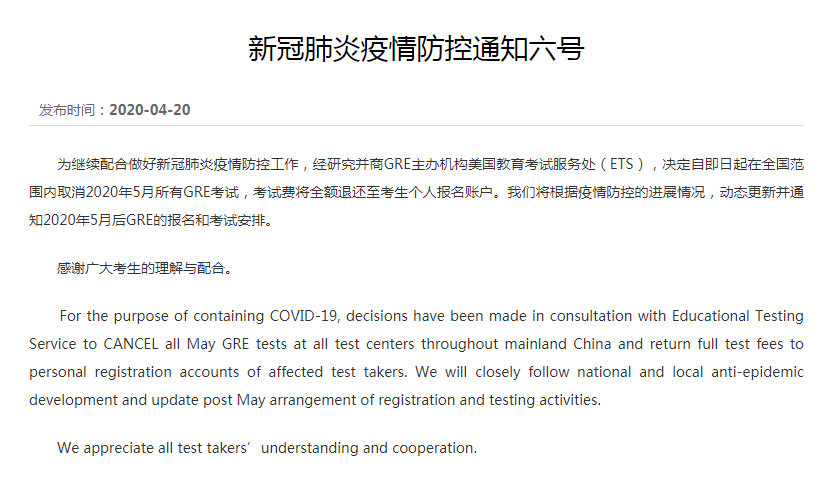 早在3月底的时候,GMAT官方放出了大量5月考位,让大家看到了GMAT考试即将恢复考试的曙光,不过因为时局变化,4月20日,GMAT官方*中国教育考试网再次发布【新冠肺炎防控通知六号文件】, 宣布中国大陆地区5月GMAT考试全部取消。