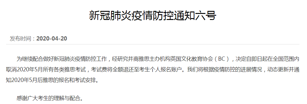 为继续配合做好新冠肺炎疫情防控工作,经研究并商雅思主办机构英国文化教育协会(BC),决定自即日起在全国范围内取消2020年5月所有各类雅思考试,考试费将全额退还至考生个人报名账户。我们将根据疫情防控的进展情况,动态更新并通知2020年5月后雅思的报名和考试安排。