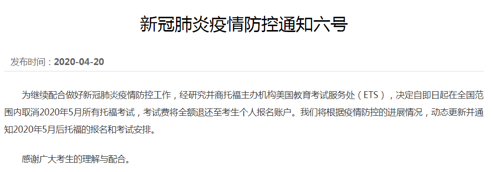 为继续配合做好新冠肺炎疫情防控工作,经研究并商托福主办机构美国教育考试服务处(ETS),决定自即日起在全国范围内取消2020年5月所有托福考试,考试费将全额退还至考生个人报名账户。我们将根据疫情防控的进展情况,动态更新并通知2020年5月后托福的报名和考试安排。