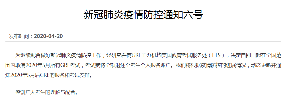 为继续配合做好新冠肺炎疫情防控工作,经研究并商GRE主办机构美国教育考试服务处(ETS),决定自即日起在全国范围内取消2020年5月所有GRE考试,考试费将全额退还至考生个人报名账户。我们将根据疫情防控的进展情况,动态更新并通知2020年5月后GRE的报名和考试安排。