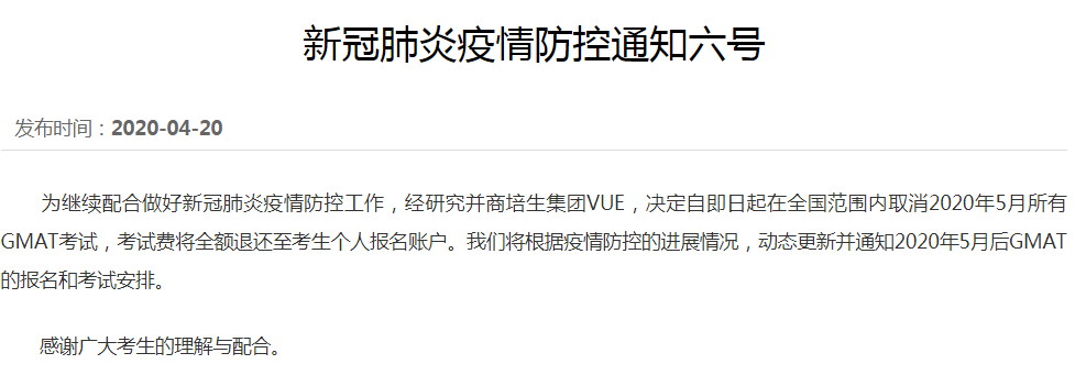 为继续配合做好新冠肺炎疫情防控工作,经研究并商培生集团VUE,决定自即日起在全国范围内取消2020年5月所有GMAT考试,考试费将全额退还至考生个人报名账户。我们将根据疫情防控的进展情况,动态更新并通知2020年5月后GMAT的报名和考试安排。