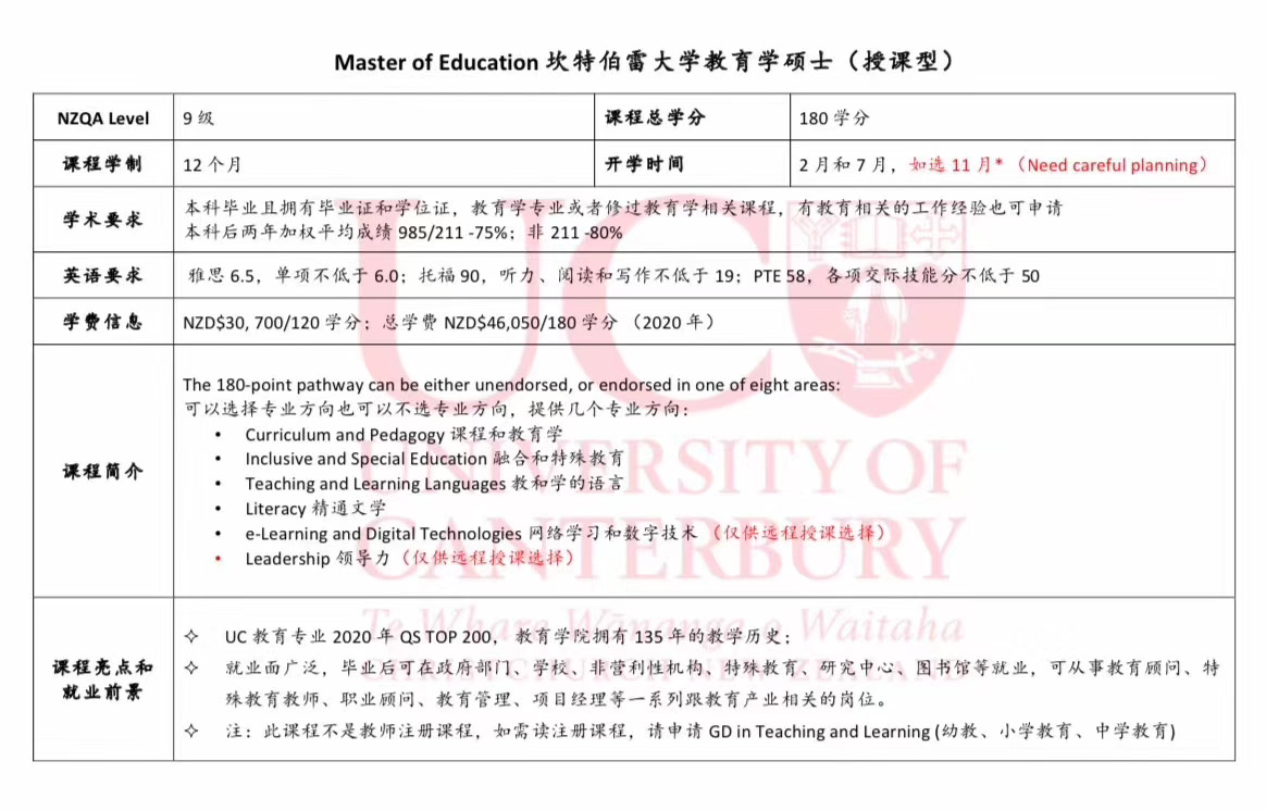 ️180学分的Master of Eucation:9级1年制授课型硕士,2月和7月开学,总学费46050纽币。可选择专业方向也可不选,有3个可选方向:课程内容和教学法、融合和特殊教育、教和学的语言。适合本科是教育学、心理学或者相关专业的本科毕业生,若无专业背景但有多年教育工作经验也可申请,雅思6.5/6.0,毕业后,可申请3年工签