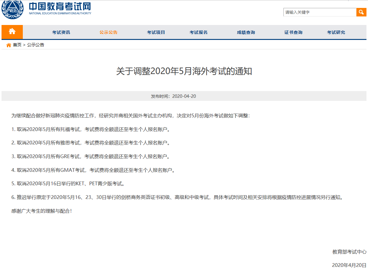 关于调整2020年5月海外考试的通知 - 中国教育考试网
