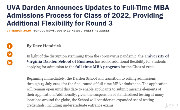 将其全日制MBA课程的正式启动时间从8月3日推迟到8月31日,并将第4轮的截止日期从最初的4月6日延长至7月13日。