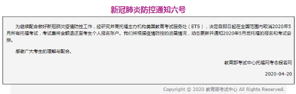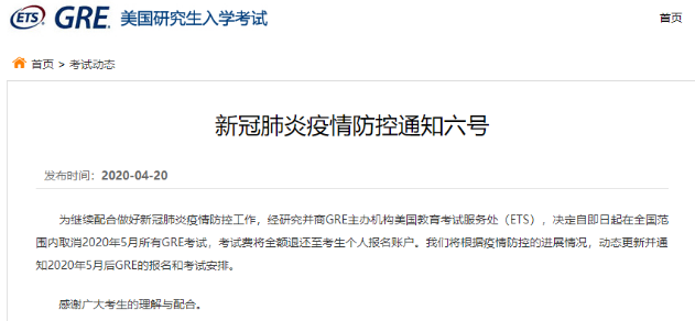 根据教育部当前针对新型冠状病毒感染肺炎疫情防控的相关要求,美国教育考试服务中心(ETS)与教育部考试中心(NEEA)共同商讨决定 取消中国大陆地区五月份所有托福和GRE普通考试 。