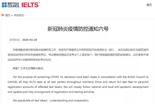 根据教育部对于新冠肺炎防控的安排,教 育部考试中心与英国文化教育协会按要求即日起取消中国大陆地区2020年5月各类雅思考试,考试费将全额退还至考生个人报名账户。