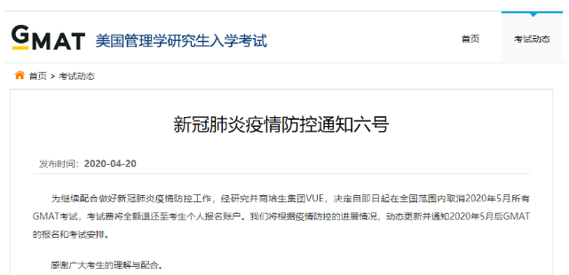 教育部为继续配合做好新冠肺炎疫情防控工作,经研究并商培生集团VUE,决定自即日起在全 国范围内取消2020年5月所有GMAT考试 ,考试费将全额退还至考生个人报名账户 。 我们将根据疫情防控的进展情况,动态更新并通知2020年5月后GMAT的报名和考试安排。