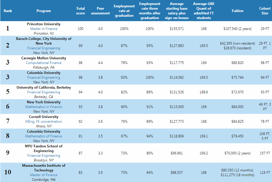 虽然申请竞争大,学习难度大,但是MFE在就业方面的巨大优势吸引着无数申请者。根据payscale的数据显示,该专业理学硕士的平均薪资为89,000美元,金融方向的硕士平均年薪更是达到104,000美元。