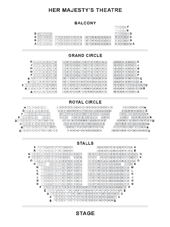 选好了订哪个剧,首先要考虑到要订什么时间,哪个位置的票子。拿歌剧魅影的上演剧院Her Majesty’s Theatre为例,剧院一共分为四层,从下到上分别是Stalls、Royal Circle、Gran Circle和Balcony,一般离舞台越近的票子越贵。