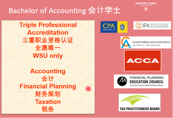 除了房地产专业,专业会计也是西悉尼的一大亮点,西悉尼的专业会计硕士受到ACCA认证,ACCA共包含14门考试,完成课程后直接免去11门考试,再完成3门考试就可以直接拿到ACCA证书。