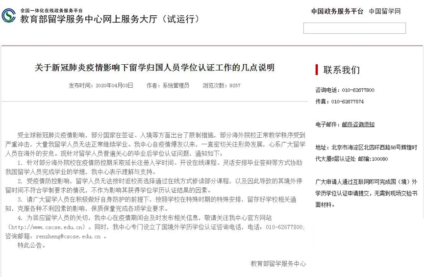 为回应留学人员的关切,我中心在疫情期间会及时发布相关信息,敬请关注我中心官方网站( http://www.cscse.eu.cn )。同时,我中心专门设立了国境外学历学位认证咨询电话,电话: 010-62677800 ;咨询邮箱: renzheng@cscse.eu.cn 。