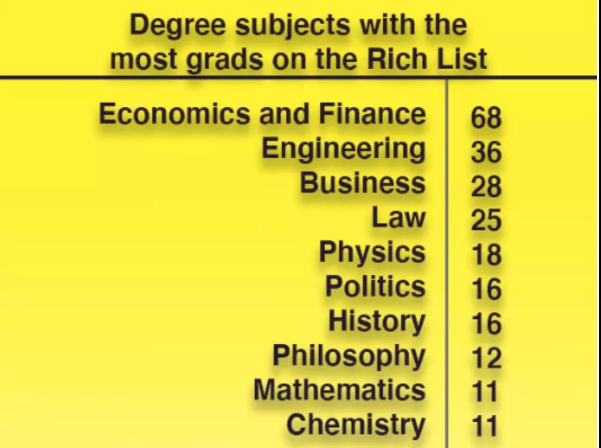 每年,《星期日泰晤士报》都会评选出英国最富有的1000人。最近一次是在2019年5月发布。富豪们的教育背景也备受关注。 这1000人中338人公布了自己的学位信息。 不出所料, 经济与金融 仍是最佳选择。 经济与金融专业的富豪数量几乎是榜单第二名的两倍。 如果想看比较有冲击力的部分, 政治和哲学 的排名竟然高于 数学和化学 专业。 榜单在这里: