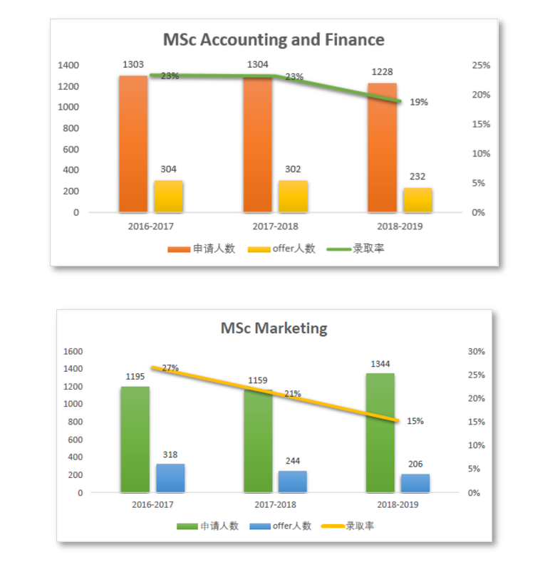 从表格中直观感受不到的信息,我们又做出了统计图,从历年来申请人数最多的两个专业 MSc Accounting an Finance 和 MSc Marketing 说起