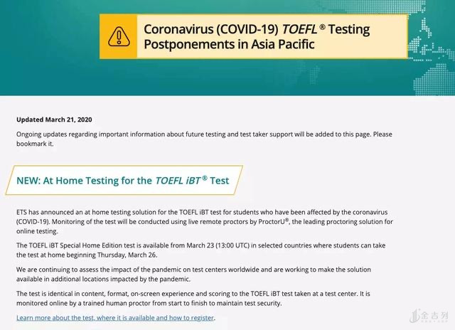 ETS在其官网宣布,因受蔓延全球的新冠肺炎(COVID-19)疫情影响,正式推出托福家庭考试(At Home Testing for the TOEFL iBT Test)!此前,ETS已接连宣布取消全球范围内,4、5月份的所有托福考试。