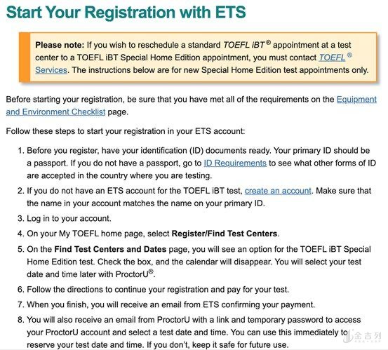符合条件的考生可以登录自己的托福账户(如没有需新建),在My TOEFL主页找到“Register/Fin Test Centers”并点击进入,可找到“TOEFL iBT Special Home Eition test”;点击并按照指示预约、缴费后,会收到ETS的确认邮件,并收到ProctorU的邮件链接,考生可点击链接选择考试日期及时间。