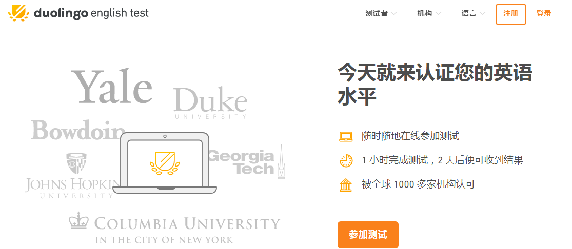 Duolingo English Test 是一项面向当今国际学生和机构的现代英语水平评估测试。测试可根据需要在线提供。您可以通过电脑和网络摄像头在家进行测试,而无需预约或前往考试中心参加测试,测试使用计算机自适应技术,让问题难度将就考生的水平。测试还包括视频面试和写作样本,当您将结果与分数发送至机构时,这些样本将同时发送至相关机构。