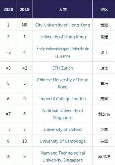 从前十的院校来看,主要被 瑞士 、 中国香港 、 英国 和 新加坡 包揽。 除了香港三所大学,还有2所来自瑞士,分别是洛桑联邦理工学院和苏黎世联邦理工学院;3所来自英国,帝国理工学院、牛津大学、剑桥大学;2所来自新加坡,新加坡国立大学和南洋理工大学。