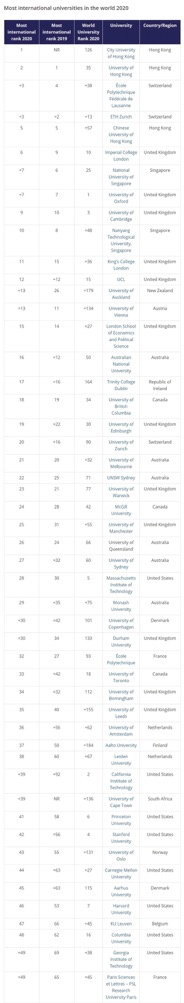 近期,THE泰晤士世界大学排名发布了2020年最具国际化大学排名( Most international universities in the worl 2020 ),入围的共有世界各地170所高校。