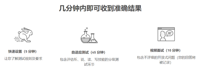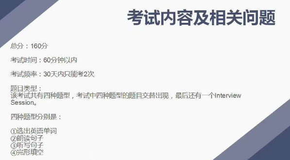 包含考核听力、阅读、写作、口语等等多方面英语能力的多种题型,这部分的测试表现会计入最终分数