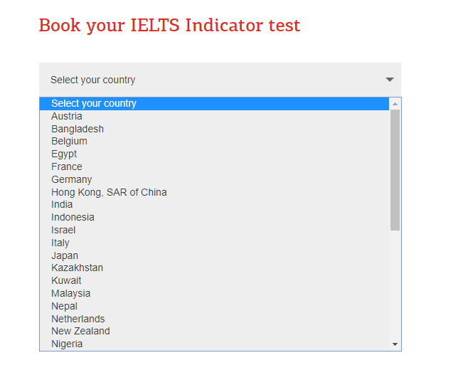目前,第一批支持IELTS Inicator的国家和地区有:中国香港、印度、英国、阿联酋、西班牙、沙特阿拉伯、意大利、印度尼西亚、菲律宾、法国、巴基斯坦、日本、卡萨克斯坦、德国、尼泊尔、新西兰、乌兹别克斯坦、斯里兰卡、科威特、埃及、荷兰、瑞士、比利时、葡萄牙、以色列、奥地利、卡塔尔、孟加拉、俄罗斯、土耳其、越南、泰国、马来西亚、尼日利亚、新加坡、阿曼等等。