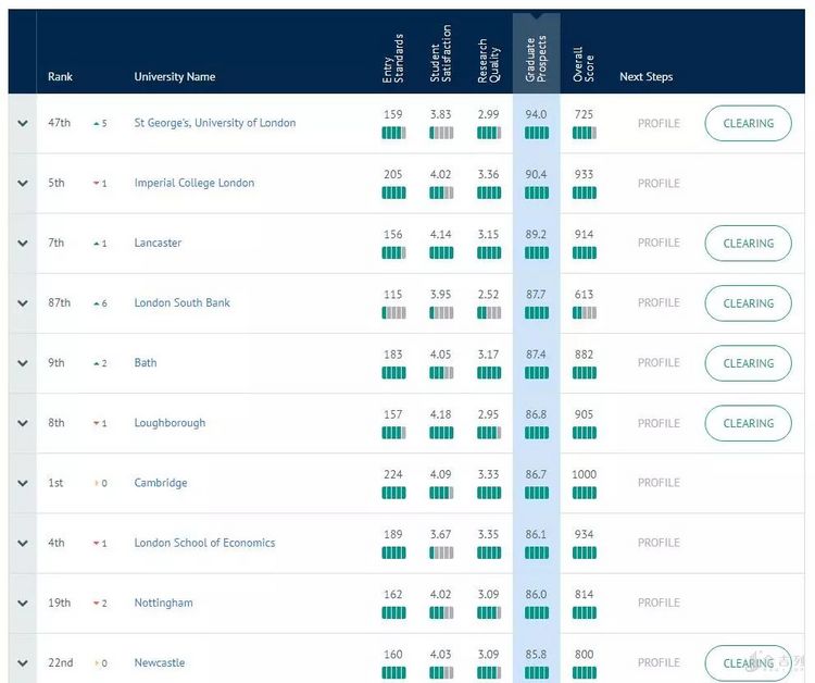 6-10的排名依次为: 巴斯大学,兰卡斯特大学,帝国理工大学,华威大学,埃克赛特大学。