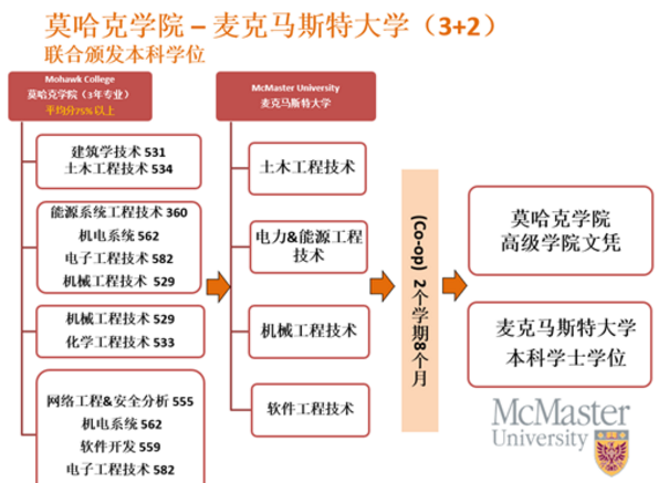 莫哈克学院3年课程平均成绩在75%以上,转入麦克马斯特大学工学院相关专业。学生在麦马工学院读完24门课程后,最终获得麦马工程学院学士学位。学生毕业后可以同时获得莫哈克3年高级大专和麦马4年本科学士学位。在目前加拿大的EE联邦移民政策下,具有双学历加分优势,在教育贡献分数上会有大约30分的额外加分。