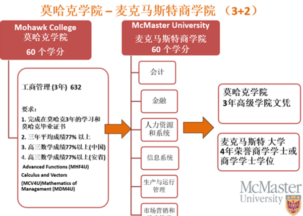 莫哈克学院3年课程平均成绩在77%以上,同时满足安省高中12年级三门数学课(加拿大境内) 或高三(中国境内)数学成绩77%以上,提供高中毕业证。满足以上要求的学生可以从莫哈克完整转60个学分进入到麦马商学院,学生从麦马专业课第三年开始就读,修读本科其余60个学分,最终获得商科本科学士学位。
