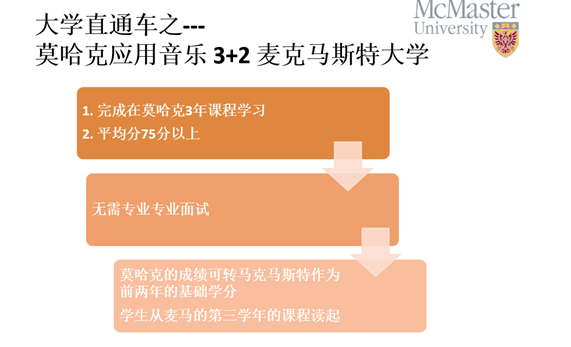 莫哈克学院3年课程平均成绩在75%以上。满足分数要求的学生可以带63个学分进入到入到麦克马斯特大学修读本科其余60个学分,最终学生毕业后将获得音乐本科学士学位。通过同麦马的大学直通车项目, 学生毕业后可以同时获得莫哈克3年高级大专和麦马4年本科学士学位。在目前的加拿大EE联邦移民政策下,是有双学历加分优势,在教育贡献分数上会有大概30分的加分。
