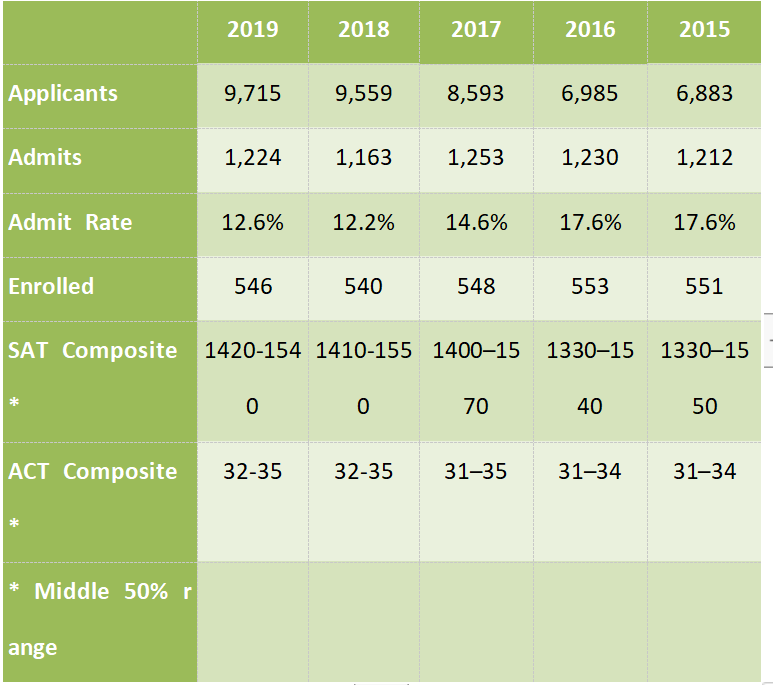 学校声明在招生政策上做到一视同仁,不会因学生的家庭经济条件而影响,超过一半的录取学生会获得学校的助学金。根据最新的2019年秋季入学招生数据统计,共9,715名申请者中1,224人被发了录取信,录取率仅为12.6%,最终546名学生选择入学,其中47%为e录取者。以下为近几年以来的大一新生录取数据: